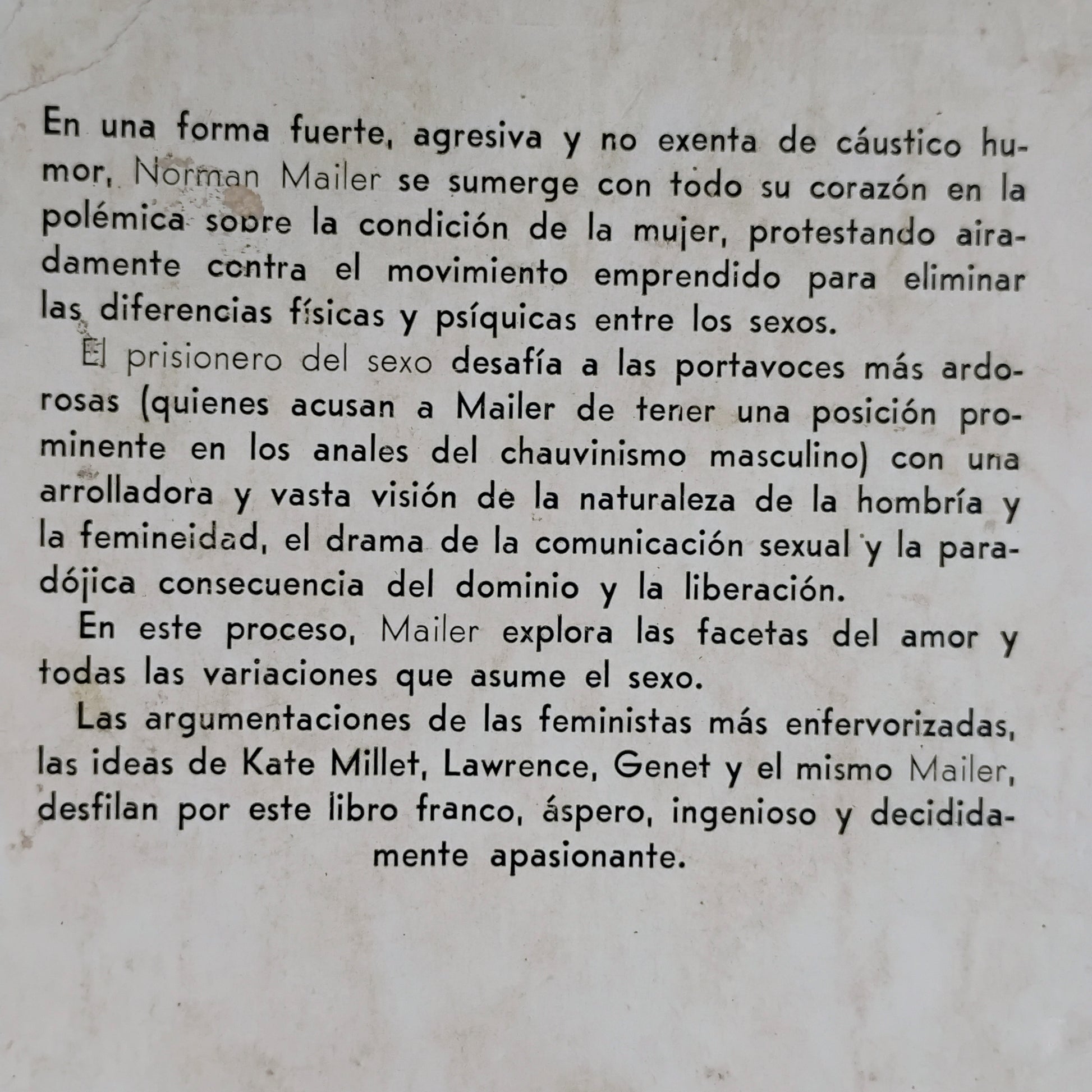 Norman Mailer nos ofrece aquí unos ensayos muy originales y sugerentes sobre la liberación de la mujer. Sexualmente abarca todos los aspectos del "choque" hombre-mujer, con una curiosa teoría que enlaza nazismos-judios-Estados Unidos. Asistimos asimismo a un crudo viaje a través del inframundo carcelario y la homosexualidad, con una asombrosa perspectiva acerca de cómo podría llegar a ser la procreación en el año 2000. Lectura imprescindible para mujeres y hombres que deseen llegar a un terreno neutral de entendimiento.